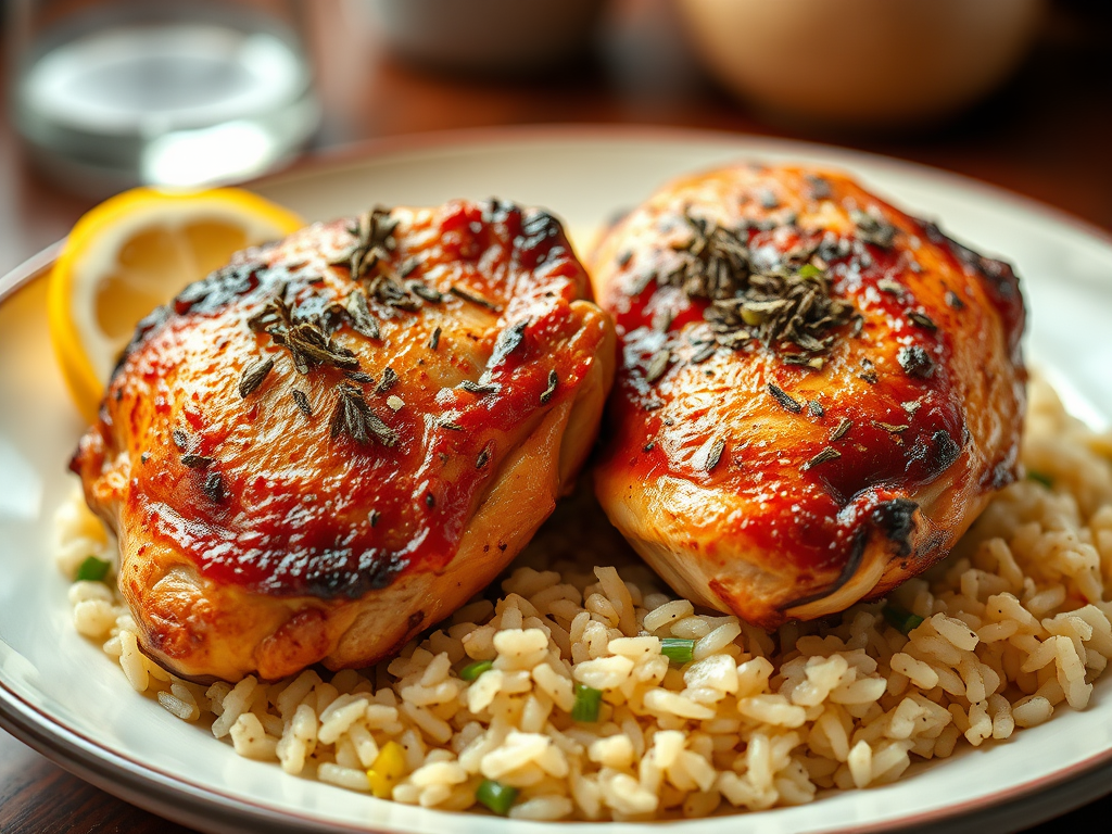- Nestle the marinated chicken thighs into the rice mixture, skin side up.