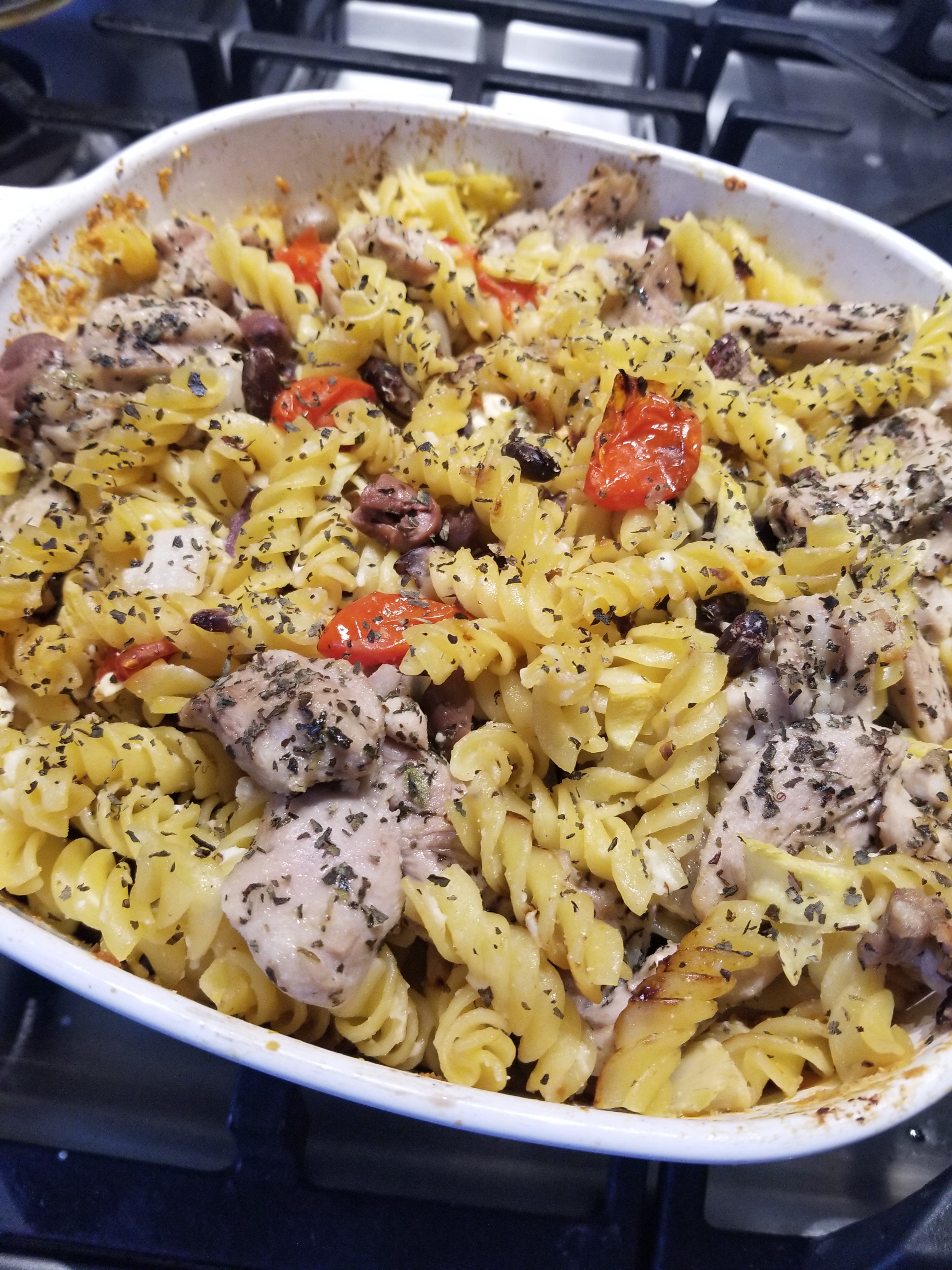 - Remove the casserole dish from the oven. Add the cooked pasta, browned chicken, artichoke hearts, beans, olives, and chopped herbs. Stir to combine.