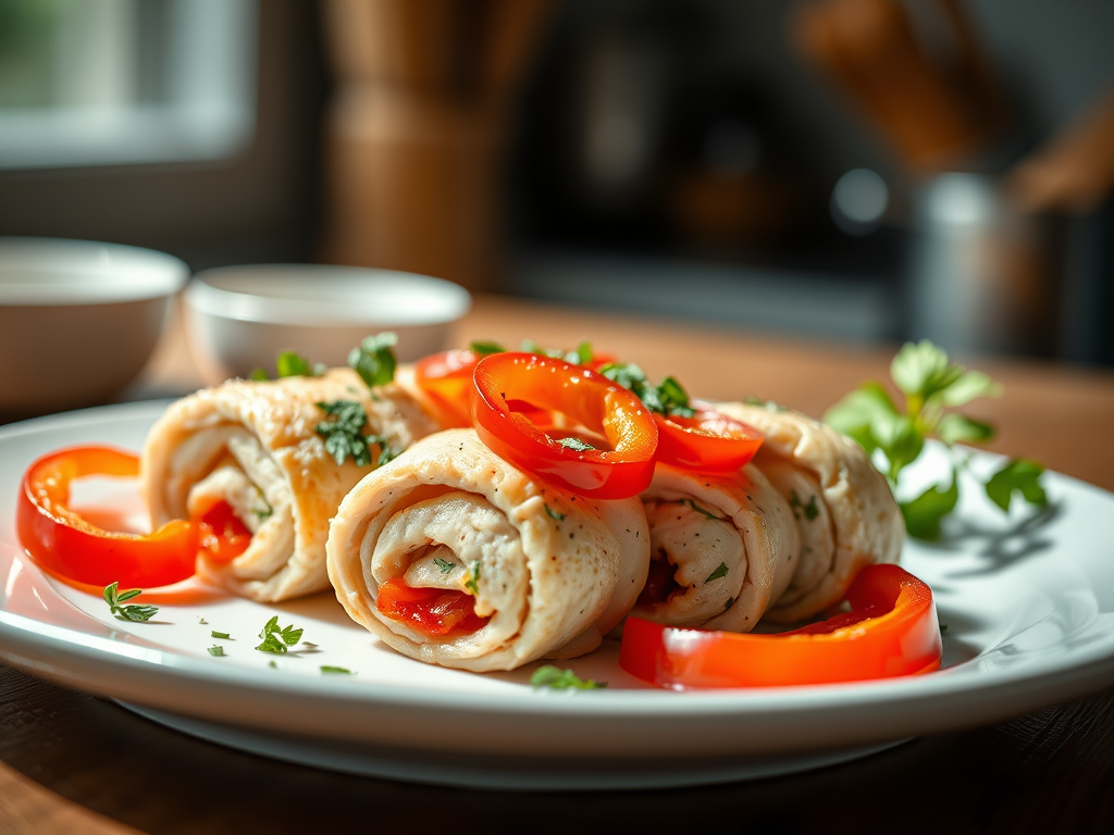 - Once chicken has marinated, evenly place bell pepper slices in the middle of the chicken cutlet, roll up and secure with a toothpick. Repeat this step until all the cutlets have been rolled up and place seam side down in a prepared baking dish.