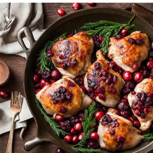 - Remove chicken from the fridge and sprinkle with desired amount of cranberries before baking. Bake uncovered skin side down for 25-35 minutes depending on the size of chicken thighs.