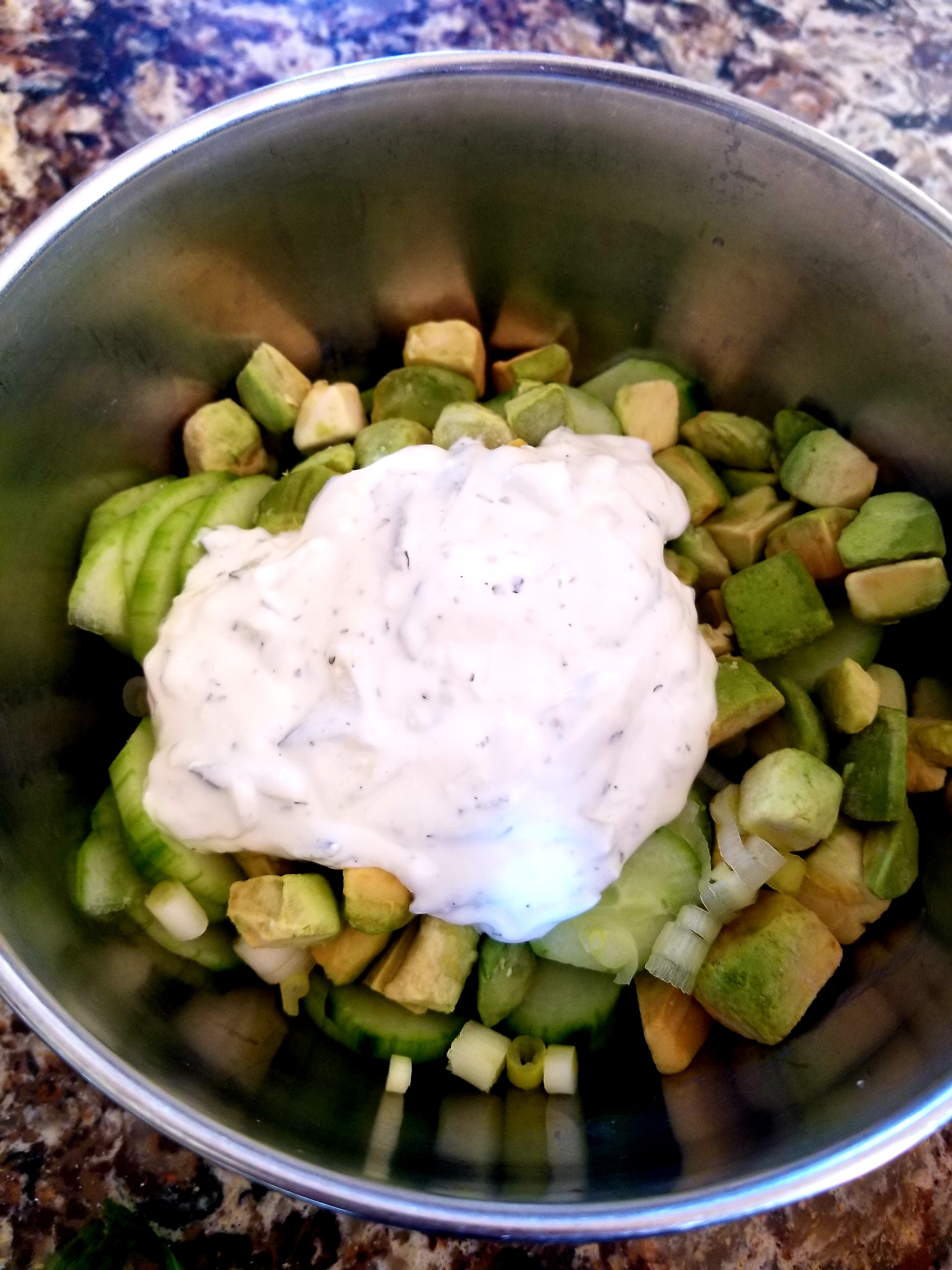 - Just before serving, pour the yogurt dressing over the top and gently toss to coat evenly.