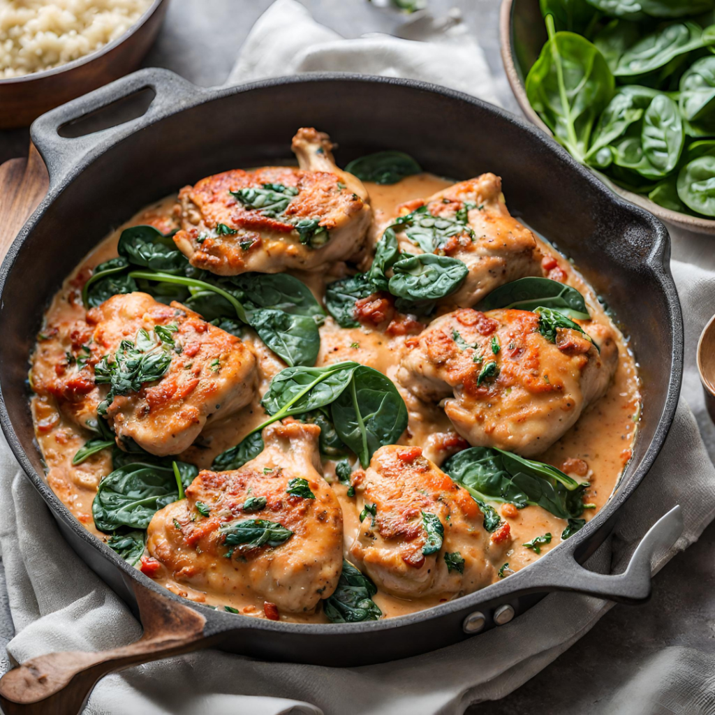 - Gradually whisk in chicken bone broth, full-fat coconut milk, and sun-dried tomatoes. Bring to a boil; reduce heat and simmer, stirring occasionally, until reduced and slightly thickened, about 3 minutes. Stir in spinach and coconut-based “Parmesan” (if using); season with sea salt and black pepper to taste. Return chicken to the skillet.