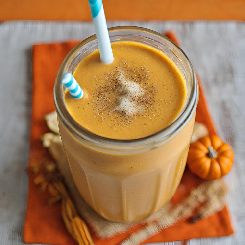 - In a blender, combine the frozen bananas, canned coconut milk, unsweetened almond milk, pumpkin puree, maple syrup, hemp seeds, pumpkin pie spice, ground cinnamon, and ice cubes.