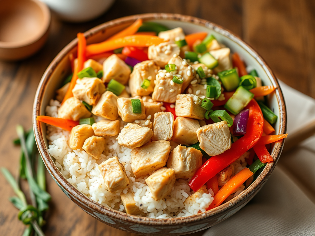- Assemble: Divide the rice into meal prep containers, top with the chicken and vegetables, and garnish with sesame seeds and green onions.